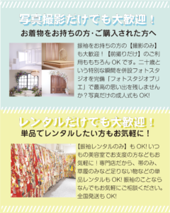 お持ちの振袖での撮影のみももちろんOK!併設フォトスタジオ「フォトスタジオプリエール」で素敵な写真を残しましょう。