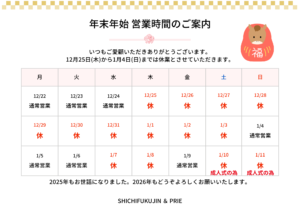 • 冬期休業期間: 2025年12月25日(木)~ 2026年1月3日(土)